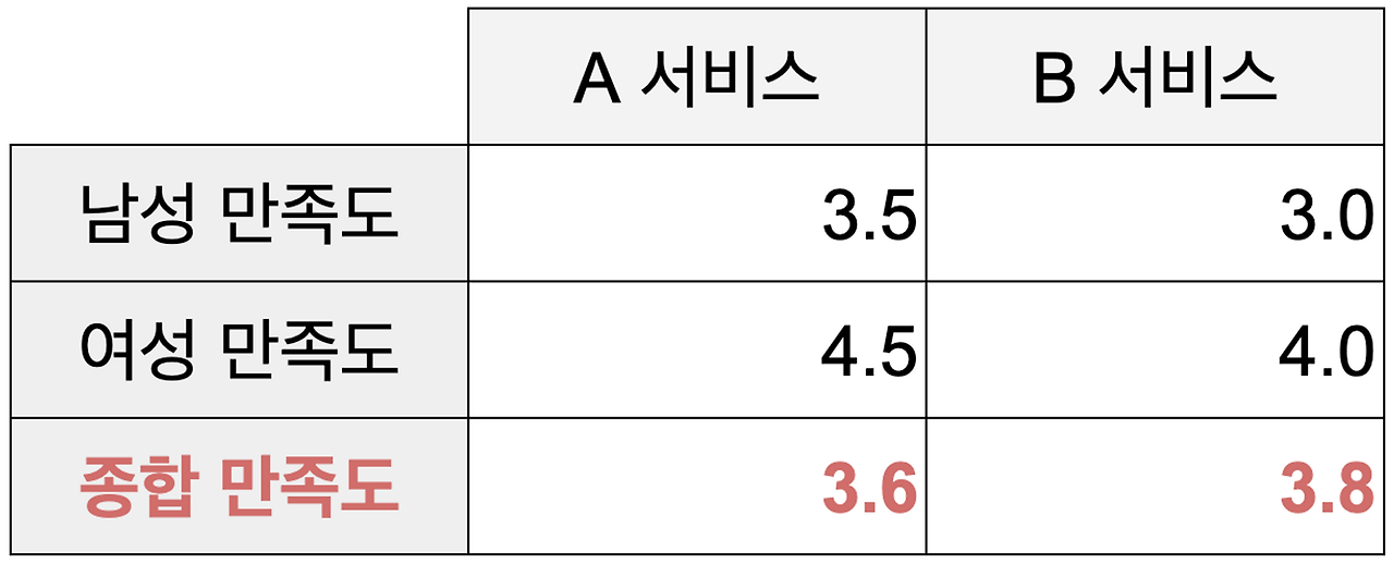 - 전체 지표와 그룹을 나눈 지표의 방향성이 다르게 나타나는 상황을 심슨의 역설이라고 함
