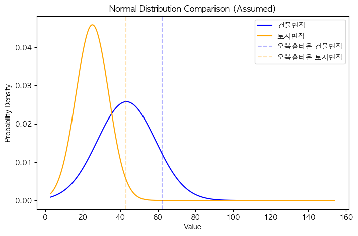 - 두 변수(건물면적, 토지면적)가 정규분포를 따른다고 가정했을 떄, 두 분포의 모양을 비교하고 특정데이터(오복홈타운)의 위치를 시각화하는 코드