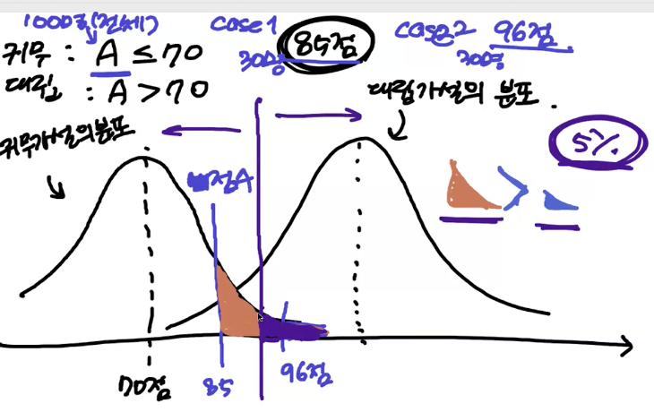 - 1종오류 (위양성): 귀무가설이 맞는데 대립가설을 채택한 경우