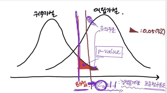 - 검정통계량 : 보라색 선, 분포 상에서 우리가 가진 표본의 위치값