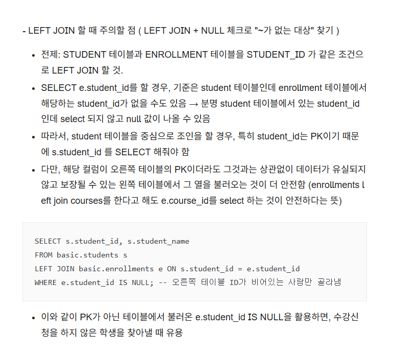 3. 오류 상황: where이 아닌 on 절에 and로 연결해서 o.animal_id is null 이라고 작성함. null 이 남아있기 위해선 on-and 사용해야한다고 잘못 생각함!