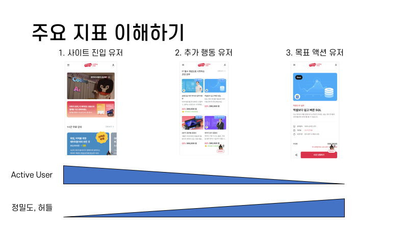 - 퍼널은 잠재고객을 유입시키며 최종적인 목표 액션을 달성할 때까지의 과정