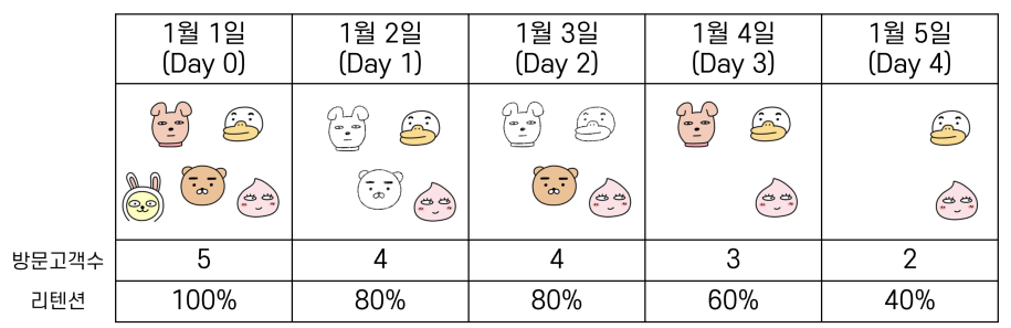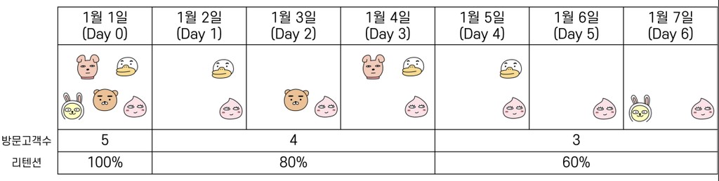 - 1월 6일에 계속 접속하지 않던 무지가 접속할 경우, 이전의 리텐션 값들이 전부 변동되는 상황이 발생할 수 있음