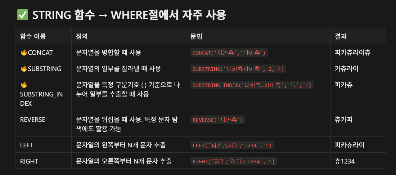 | 분류 | 대표 함수 | 설명 | GROUP BY 병행 여부 |