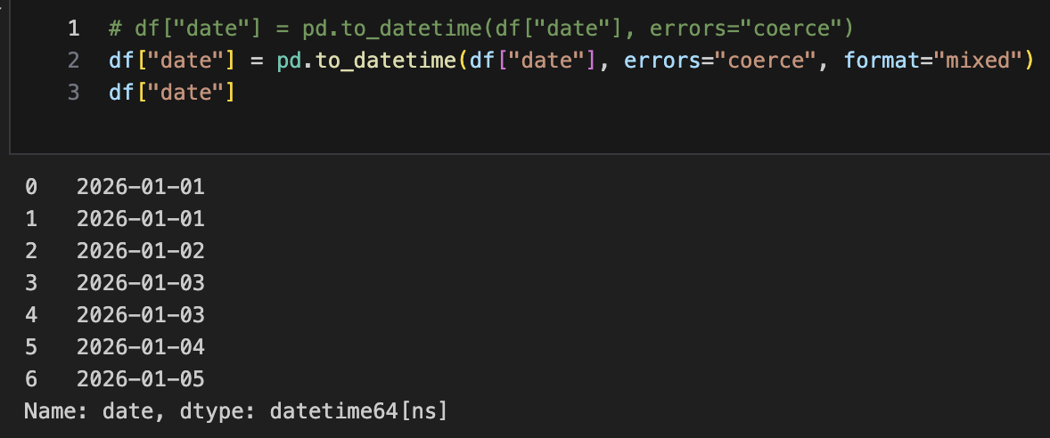 - errors="coerce": 변환 안되면 NaT(결측)로 처리