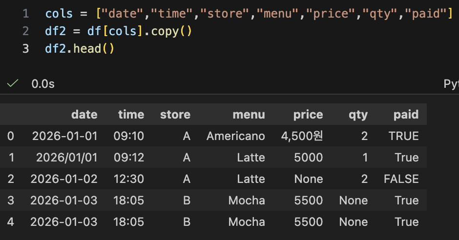 - date, time, store, menu, price, qty, paid 등 필요한 컬럼만 남기기