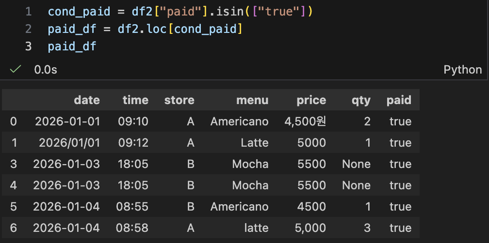 - 조건 필터링 (불리언 인덱싱) : "결제 완료 + A매장 + 오전"