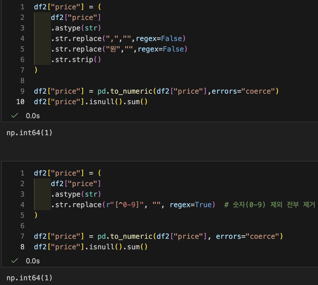 - price 정리: "원","," 제거하고 숫자로 만들기