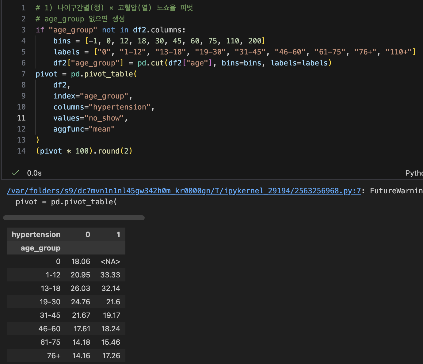 - 나이구간별(행) x 고혈압(열) 노쇼율 피벗