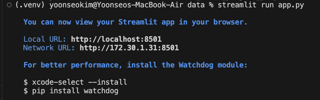 - vscode에서 app.py가 있는 디렉토리까지 이동한 후 streamlit run app.py 실행