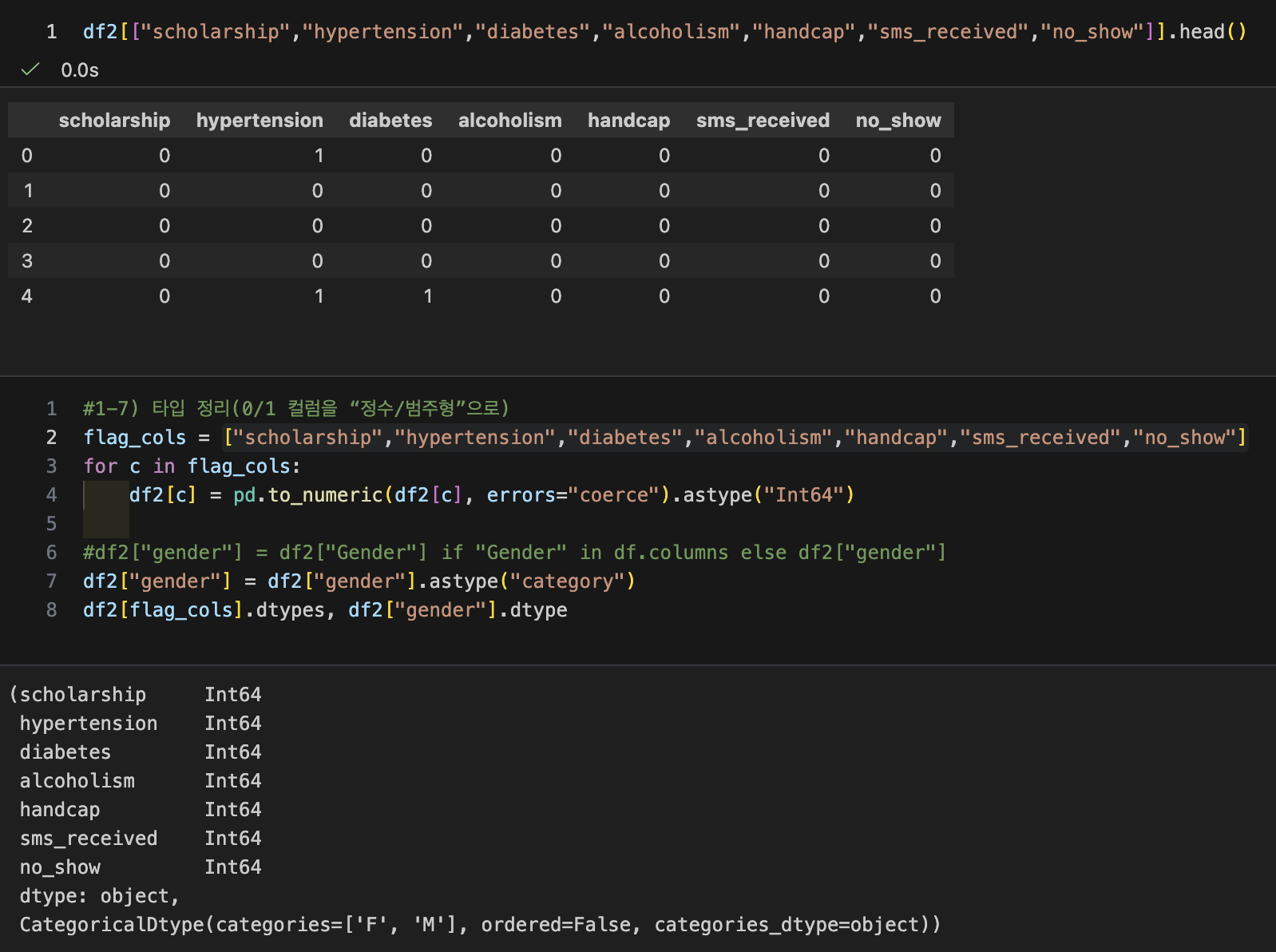 - 타입 정리 (0/1 컬럼을 "정수/범주형"으로)