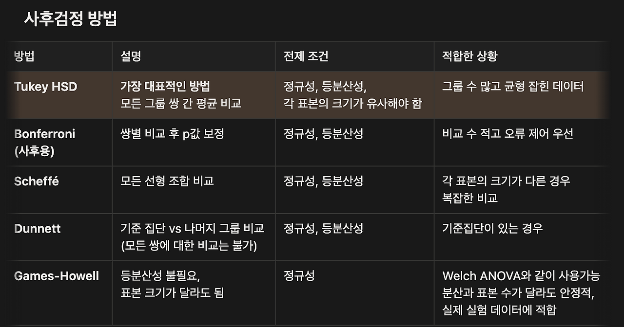 - 따라서 사후 검정 필요