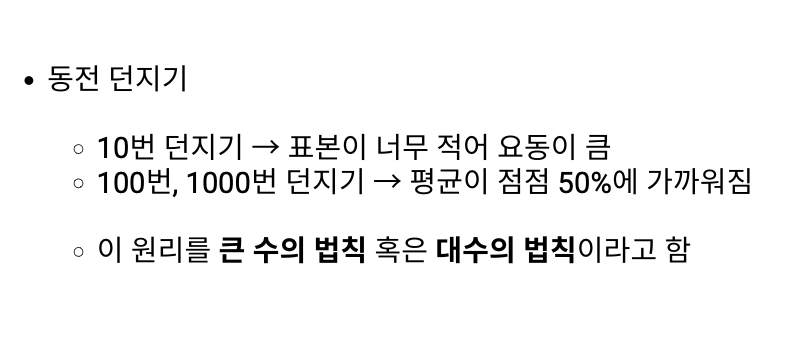 확률은 단기적으로는 불확실하지만, 장기적으로는 규칙이 드러남 (큰 수의 법칙 / 대수의 법칙)