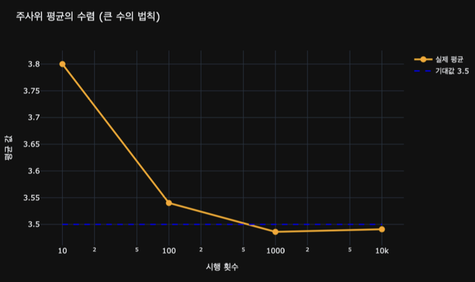 기대값은 한 번의 결과가 아니라, 많은 시도(대수의 법칙/표본크기)의 평균