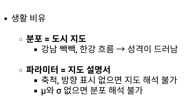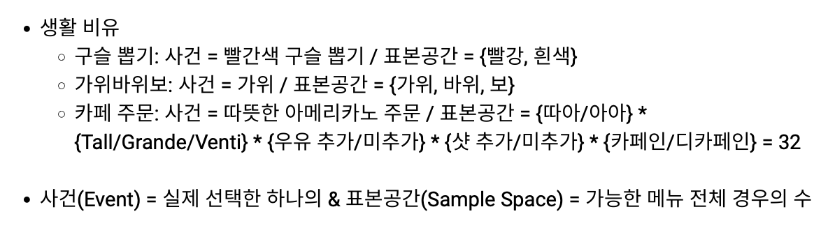 - 표본공간: 통계적 실험의 모든 가능한 결과의 집합 / 일어날 수 있는 모든 경우의 전체 (보통 중괄호 {}로 표현) -> 지도 전체 (모든 경우의 수)
