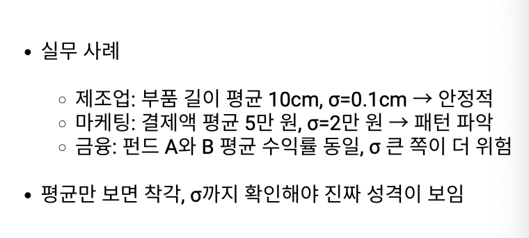 - 평균만 보면 같은 것처럼 보여도 데이터의 퍼짐은 전혀 다를 수 있음